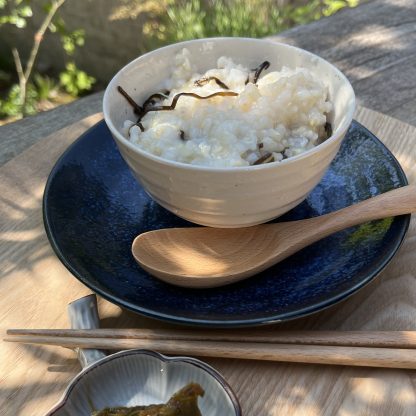 ① 炊いた玄米にピザ用チーズ、青ネギ、白ごま、塩昆布を入れて混ぜる。