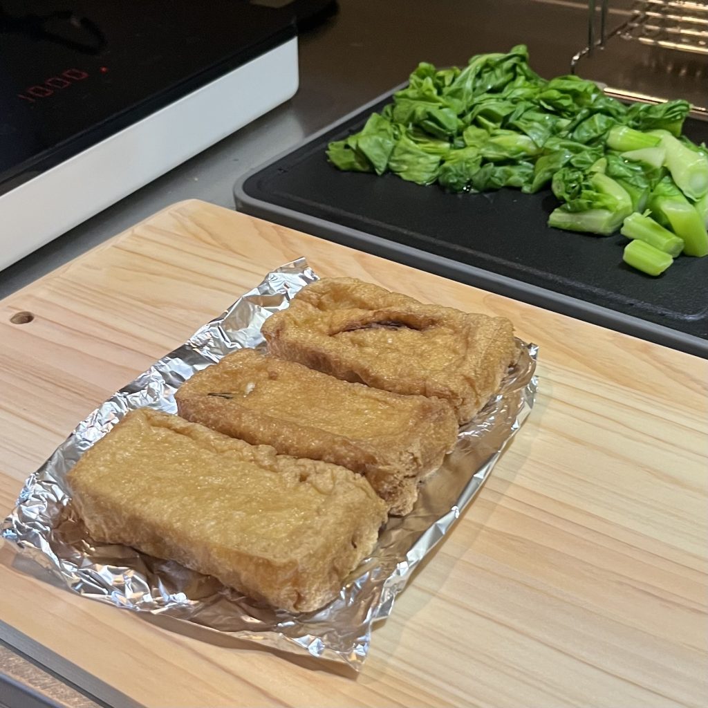 青菜は先にサッと茹でて絞り、厚揚げもオーブントースターで軽く焼いてから、それぞれカットしてお椀へセット。具なしの味噌汁を食べる直前にお椀に注ぐと、具材のおいしさが引き立ちます。