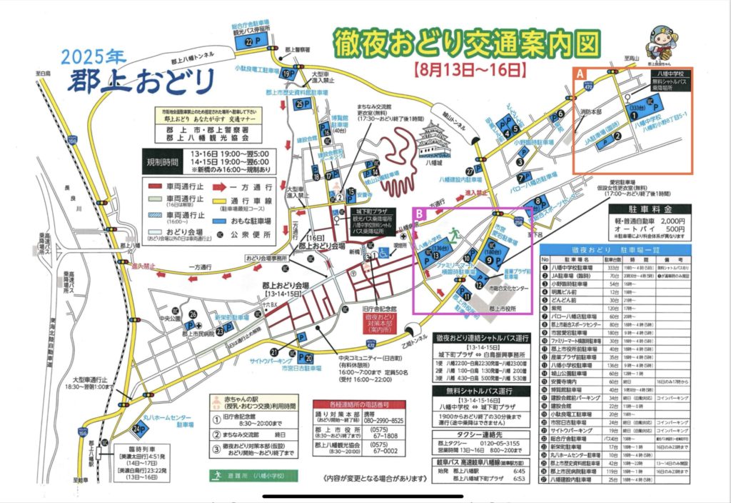 いよいよ8月13日(水)から徹夜おどり。8月16日(土)までは会場周辺は大変混雑します。駐車場案内図(2025版)へのリンクを貼っておきますので、徹夜おどりへいらっしゃる方は必ず事前にご確認ください。